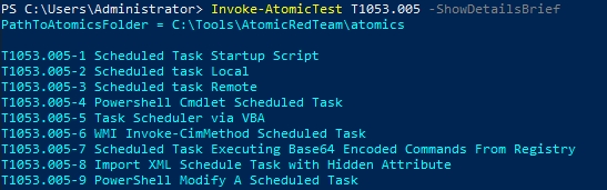 If we look at the screenshot above, we can execute these tests in multiple ways. The first way would be with the TestNumbers which runs the tests by the numbers that we see to the right of T1053.005.